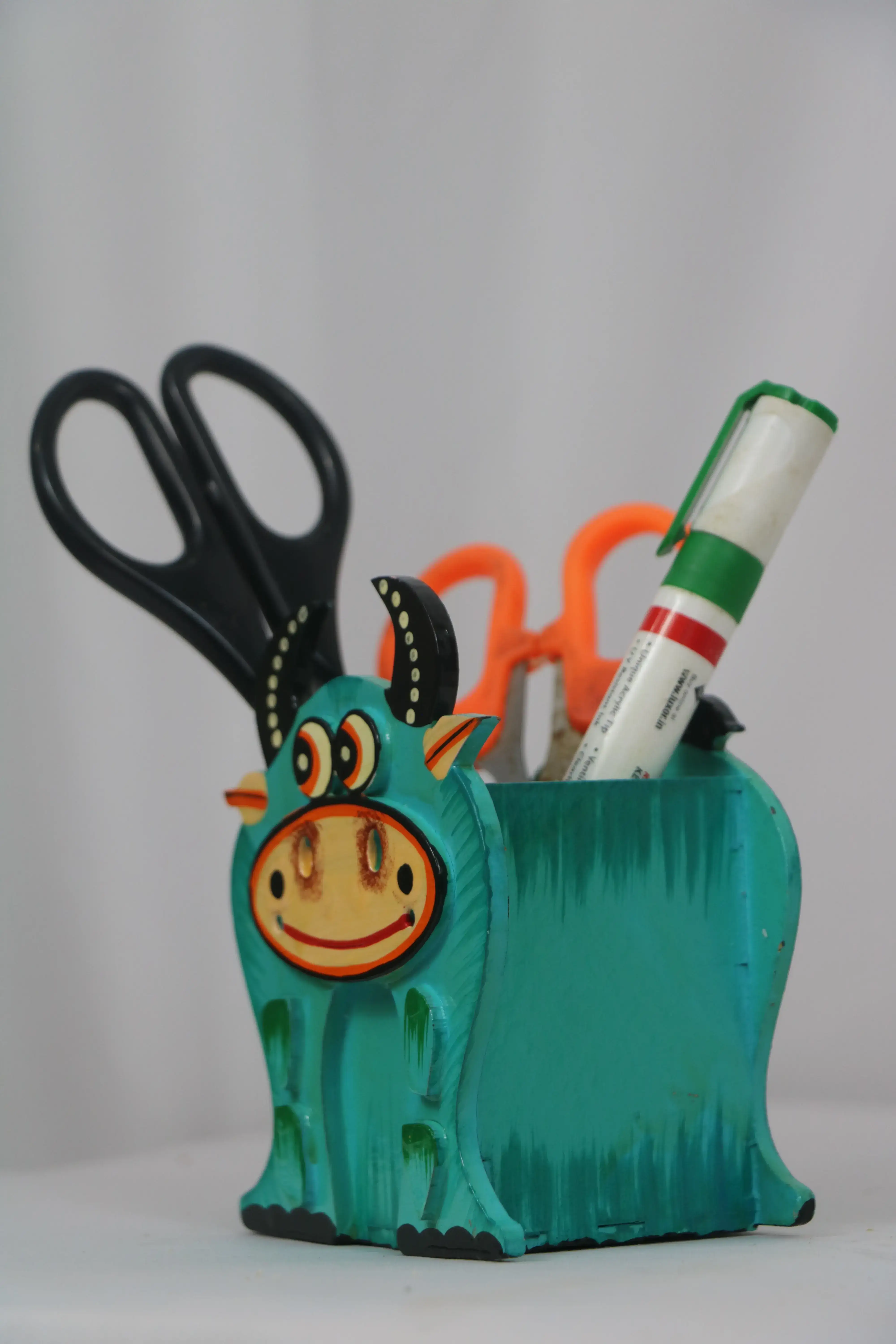 Colorful Cow Themed Pen Stand – Handcrafted Wooden Desk Accessor