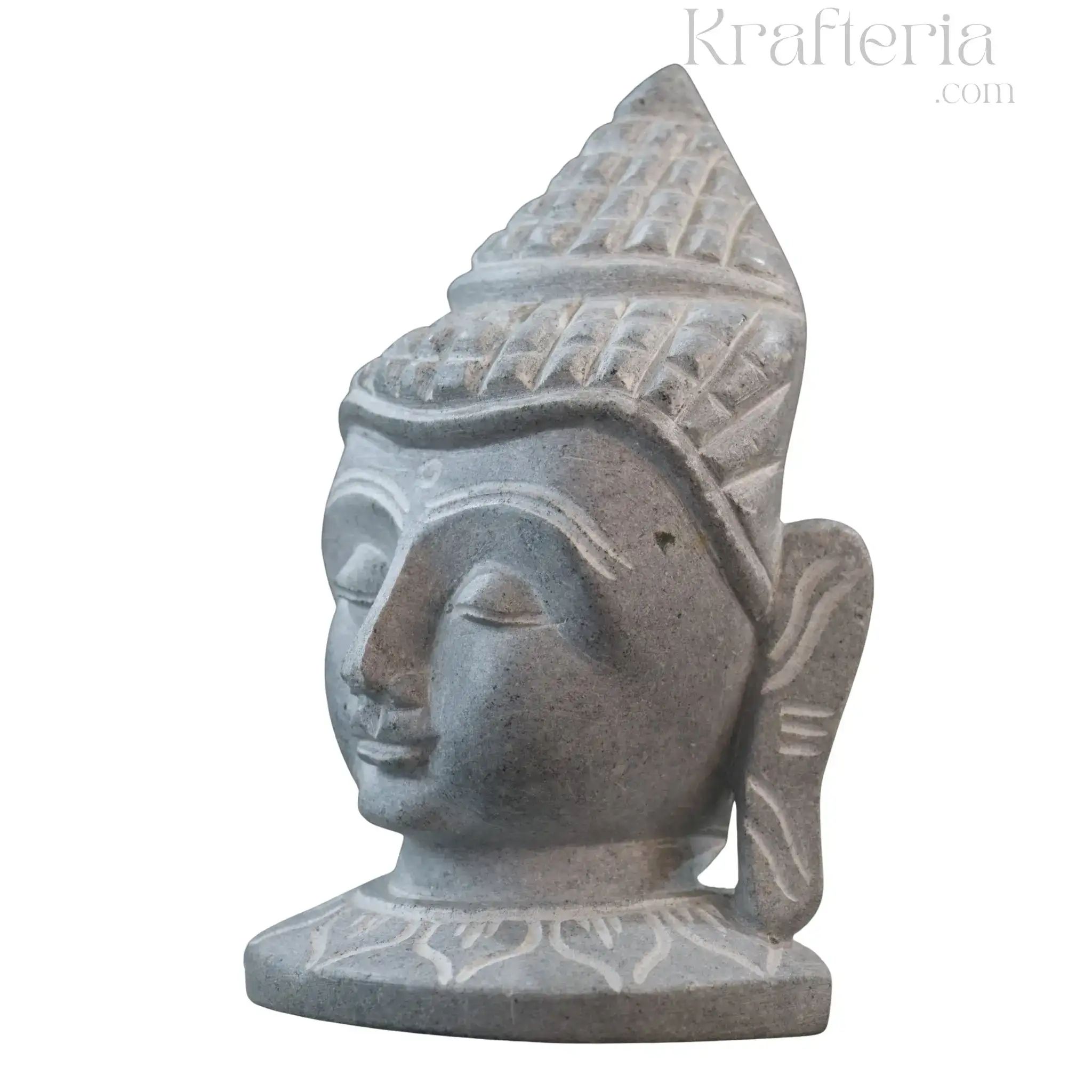 This Soft Stone Buddha Face statue is a remarkable example of Karnataka’s rich sculptural heritage. Crafted with soft soapstone, it highlights the delicate and intricate techniques perfected by skilled artisans. The base material is chloritic schist, a soapstone that is soft and workable when freshly quarried. This softness allows artisans to create detailed and expressive carvings that capture the spiritual essence of the Buddha.